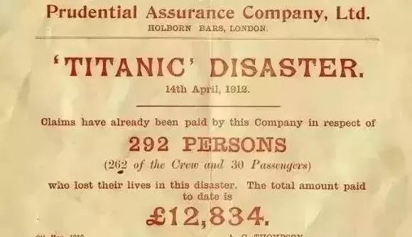 1912年4月泰坦尼克号处女航时撞上冰山后沉没,对于遇难的乘客及家属,“泰坦尼克号”是一场不折不扣的灾难,保诚公司迅速做出理赔,在不到两个月时间内,赔付14239英镑给遇难者家属,使他们在痛失亲人之后得到些许安慰。14239英镑在今天看来少得可怜,但在90年多前,这是一笔不小的收入。在保诚集团的档案馆,仍保存着这次灾难事件的很多资料。