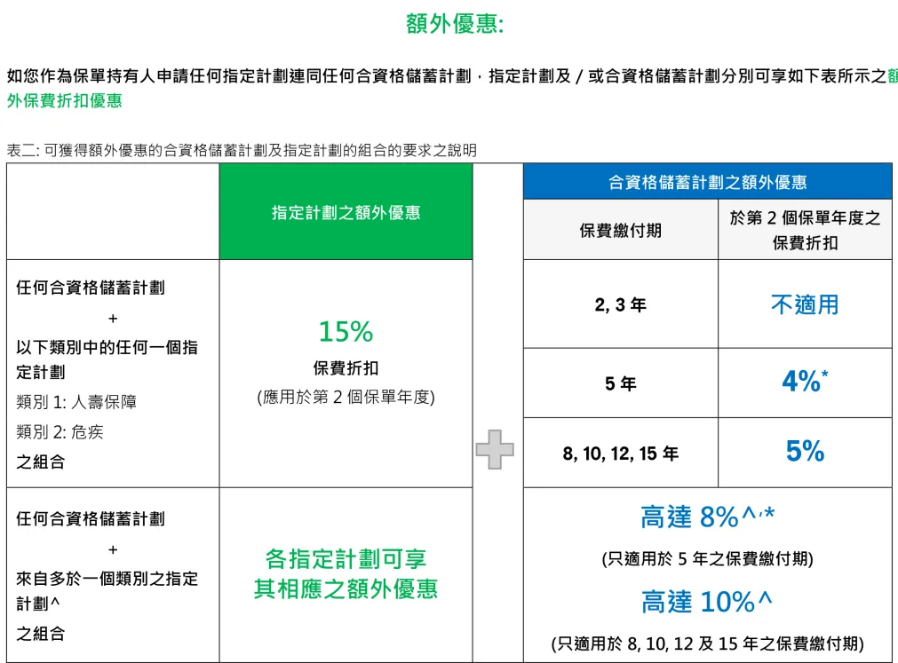 优惠:同一投保人于推广期内申请以下指定计划连同指定缴费期的合资格产品,可在现行优惠基础上,第二个保单年度额外享更高达15%/10%保费折扣优惠!