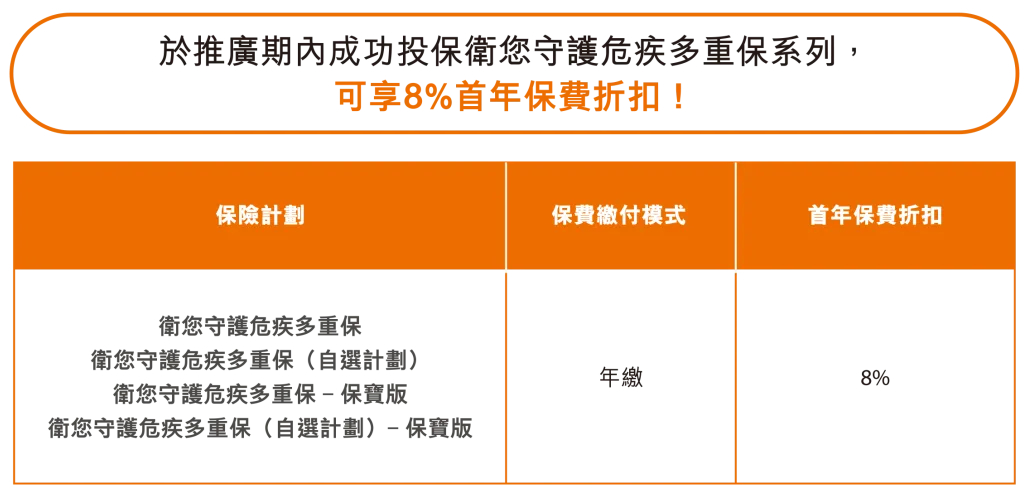 优惠:成功投保「卫您守护危疾多重保」,即享首年8%保费折扣!