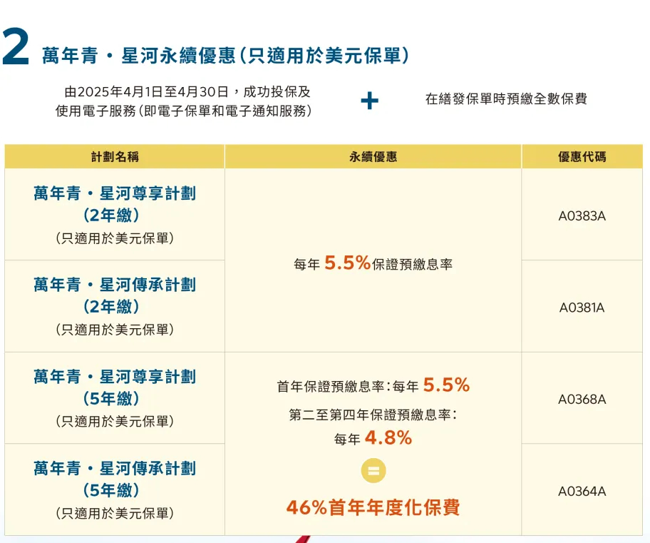 提前缴付合资格储蓄计划并申请指定计划,就提前缴付保费可享每年保证利息高达5.3%(适用于5年缴美元保单)